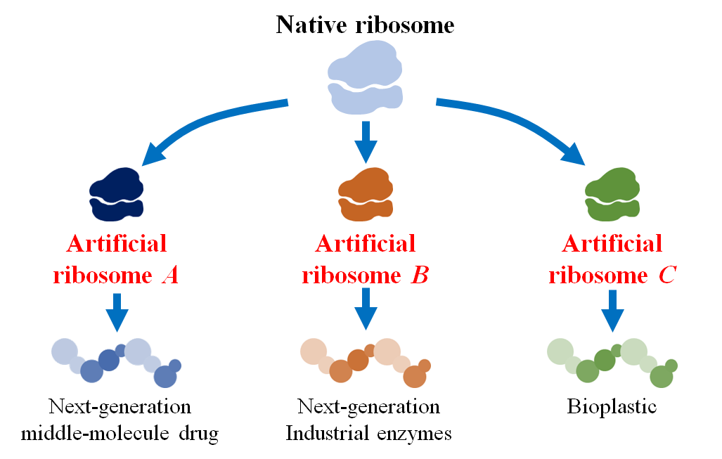 This achievement is expected to lead to the following two developments. First, it is anticipated to lead to the creation of autonomously replicating artificial cells (Figure 2). The construction of such cells would allow us to engineer them with designer genes, gene networks, and genomes to manifest virtually any phenotype permissible by the laws of physics. Second, this work is expected to greatly expand the diversity of peptides and proteins available for human use (Figure 3). By designing artificial ribosomes that can efficiently polymerize non-canonical monomers with properties different from natural amino acids, it will become possible to create next-generation middle-molecule drugs with superior characteristics, such as oral bioavailability and cell membrane permeability.
