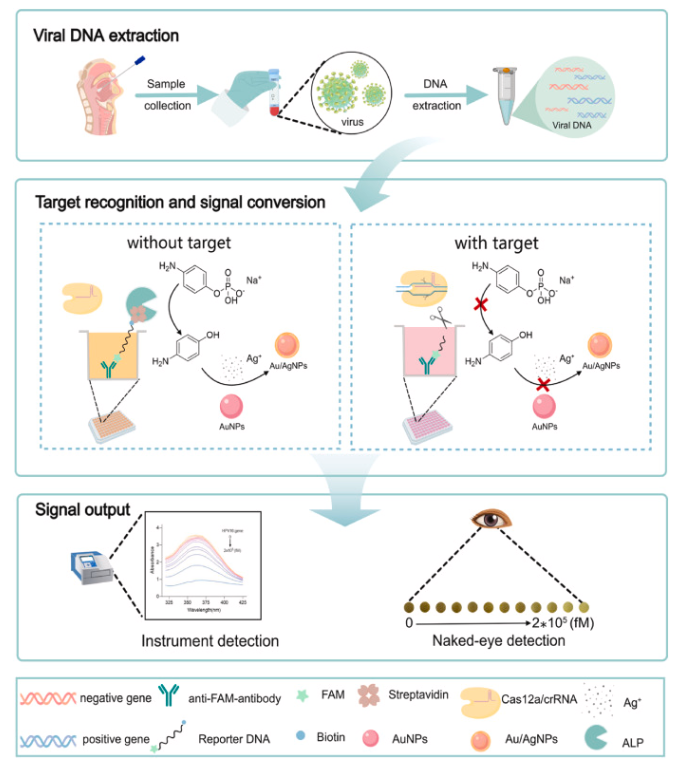 流程图1. ALP介导的CRISPR/Cas12a生物传感平台用于病毒DNA检测的示意流程图。