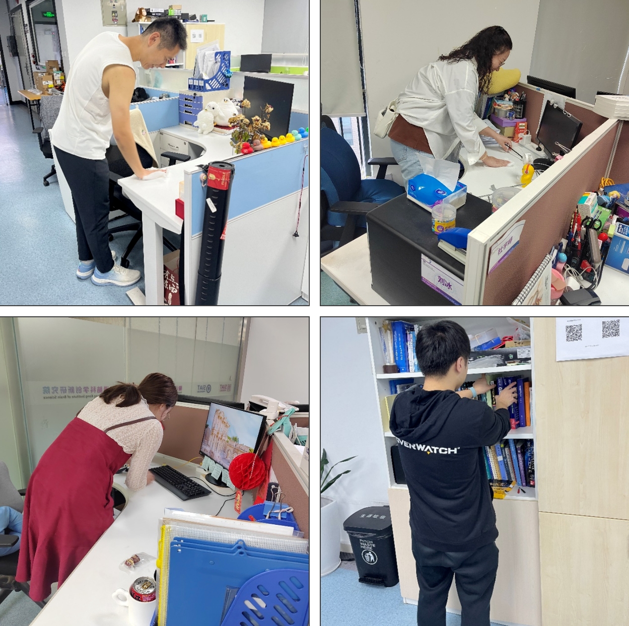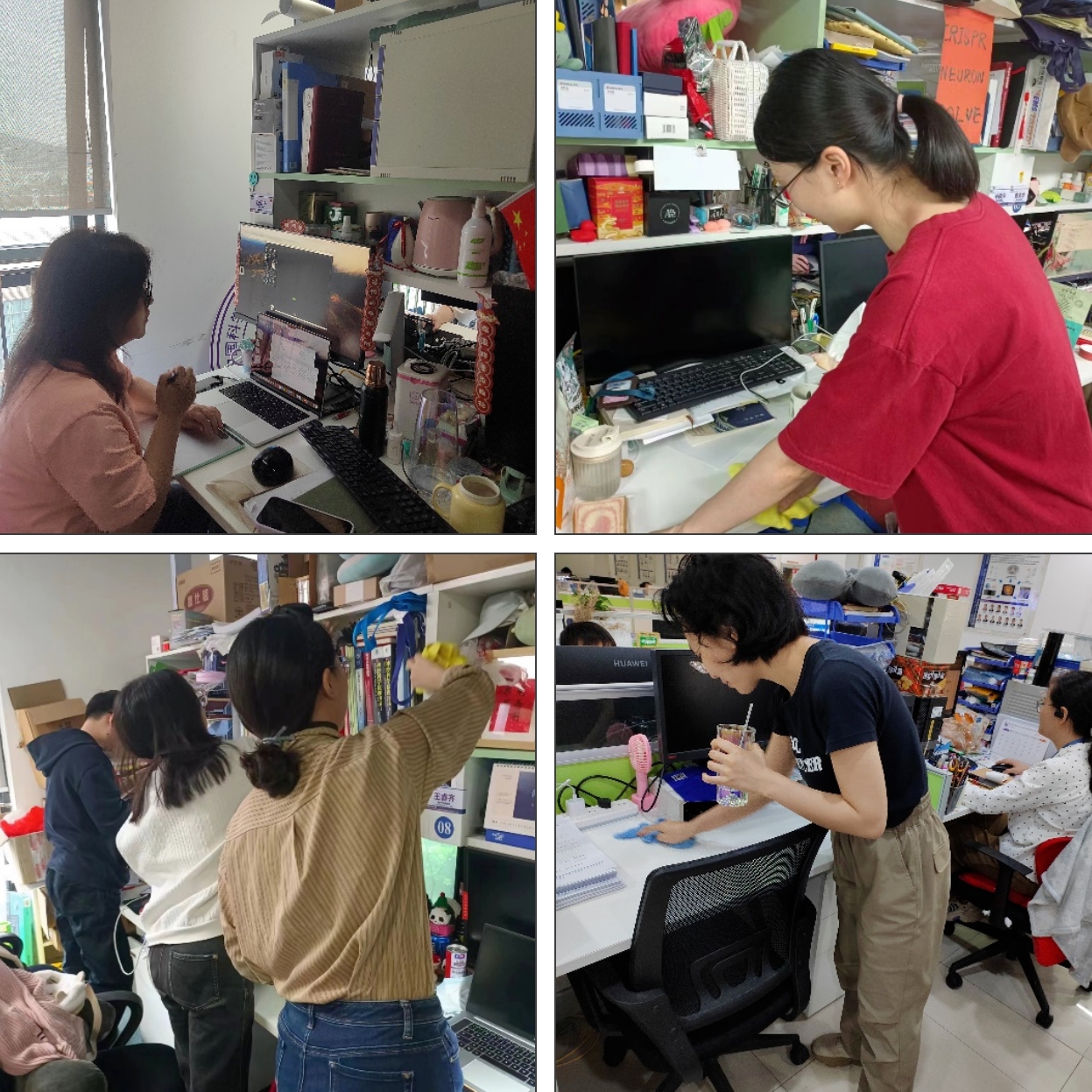 以下是部分到岗人员对日常使用的实验、办公卡位等区域进行清理的现场。