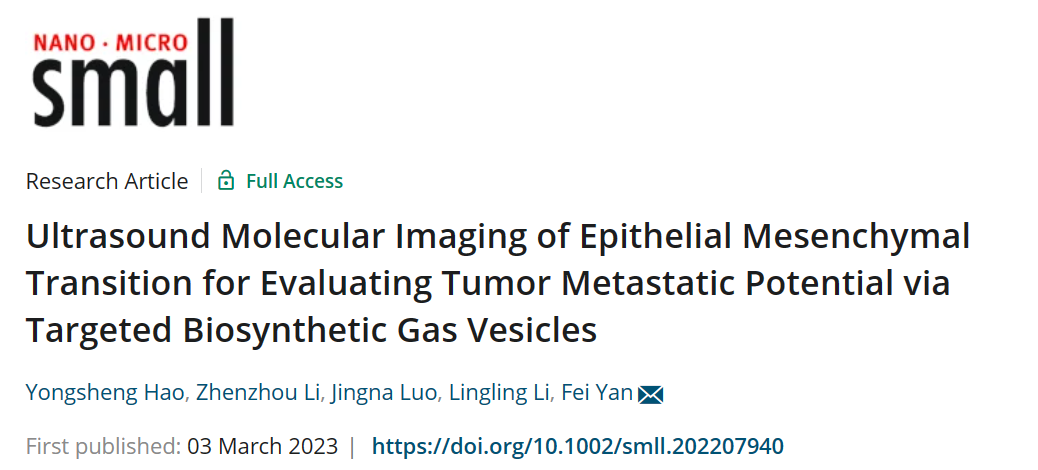 Hao Y, Li Z, Luo J, Li L, Yan F. Ultrasound Molecular Imaging of Epithelial Mesenchymal Transition for Evaluating Tumor Metastatic Potential via Targeted Biosynthetic Gas Vesicles. Small. 2023; e2207940. doi:10.1002/smll.202207940