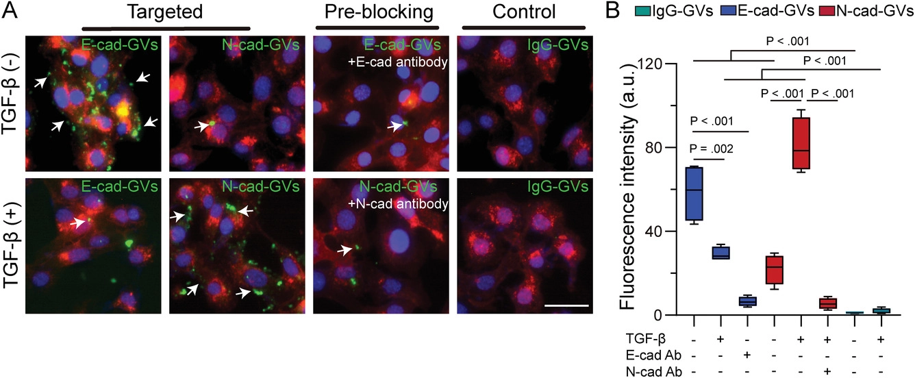图1. E-cad-GVs/N-cad-GVs探针与不同EMT状态肿瘤细胞的黏附效果