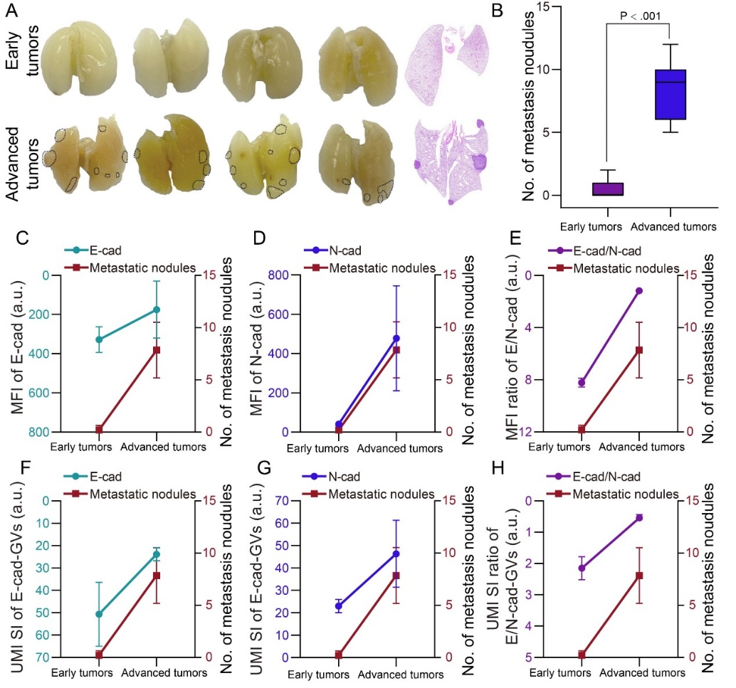 图2. E-cad-GVs/N-cad-GVs探针成像早期和晚期肿瘤EMT状态的结果