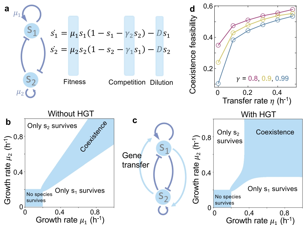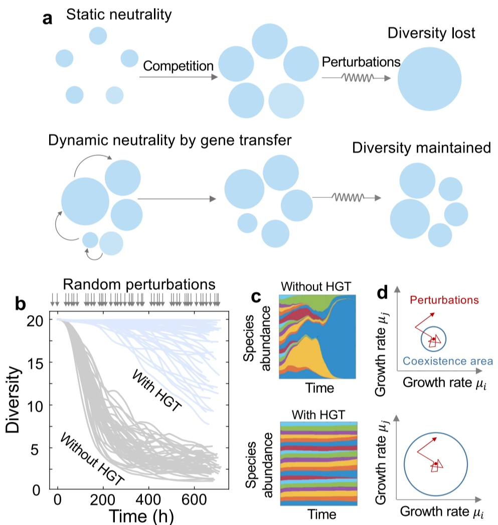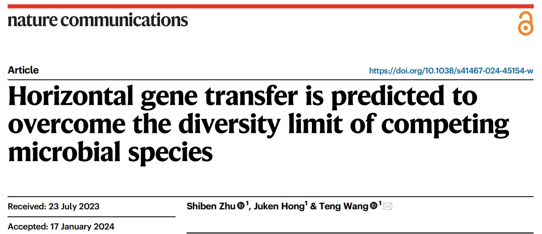 2024年1月27日,中国科学院深圳先进技术研究院合成生物学研究所材料合成生物学研究中心王腾团队在国际权威学术期刊Nature Communications发表了题为Horizontal gene transfer is predicted to overcome the diversity limit of competing microbial species的研究论文。该工作从理论上揭示了微生物群落中广泛存在的水平基因流动可以帮助竞争性微生物群体突破物种多样性“极限”,促进群落的物种多样性在环境扰动下的稳定维持。