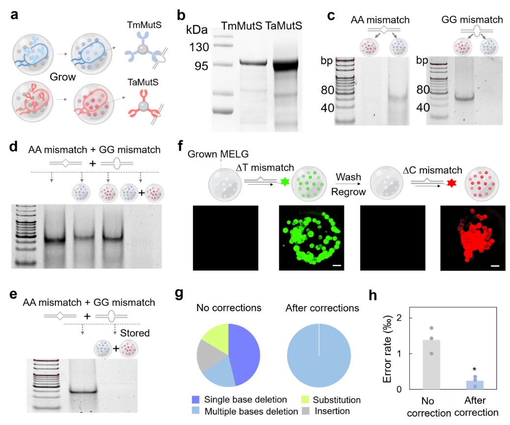图2. MutS接枝MELG移除错配DNA。a. 不同MutS接枝MELG对不同错配DNA的结合具有差异。b. E. coli释放TaMutS和TmMutS。c. MutS接枝MELG具有不同的结合偏好。d. 组合MELG去除了大部分错配DNA。e. MELG随长随用。f. MELG二次生长,再利用。g. 除多碱基缺失外,几乎所有错误都被MELG消除。h. 经MELG校正后,总体错误率降低。