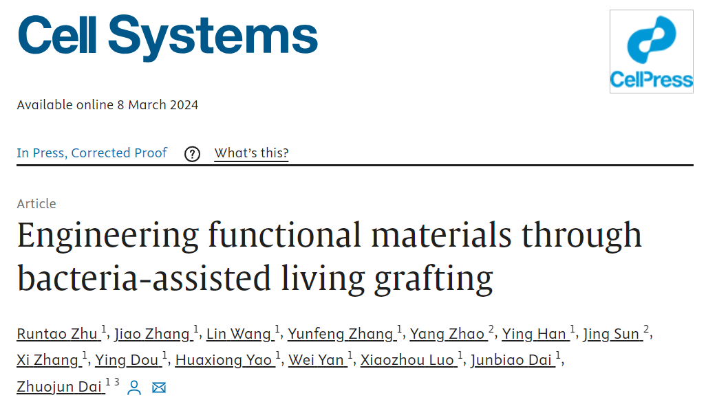 1. Runtao Zhu, Jiao Zhang, Lin Wang, Yunfeng Zhang, Yang Zhao, Ying Han, Jing Sun, Xi Zhang, Ying Dou, Huaxiong Yao, Wei Yan, Xiaozhou Luo, Junbiao Dai, Zhuojun Dai*. Engineering Functional Materials through Bacteria-assisted Living Grafting. Cell systems. 2024. DOI: 10.1016/j.cels.2024.02.003