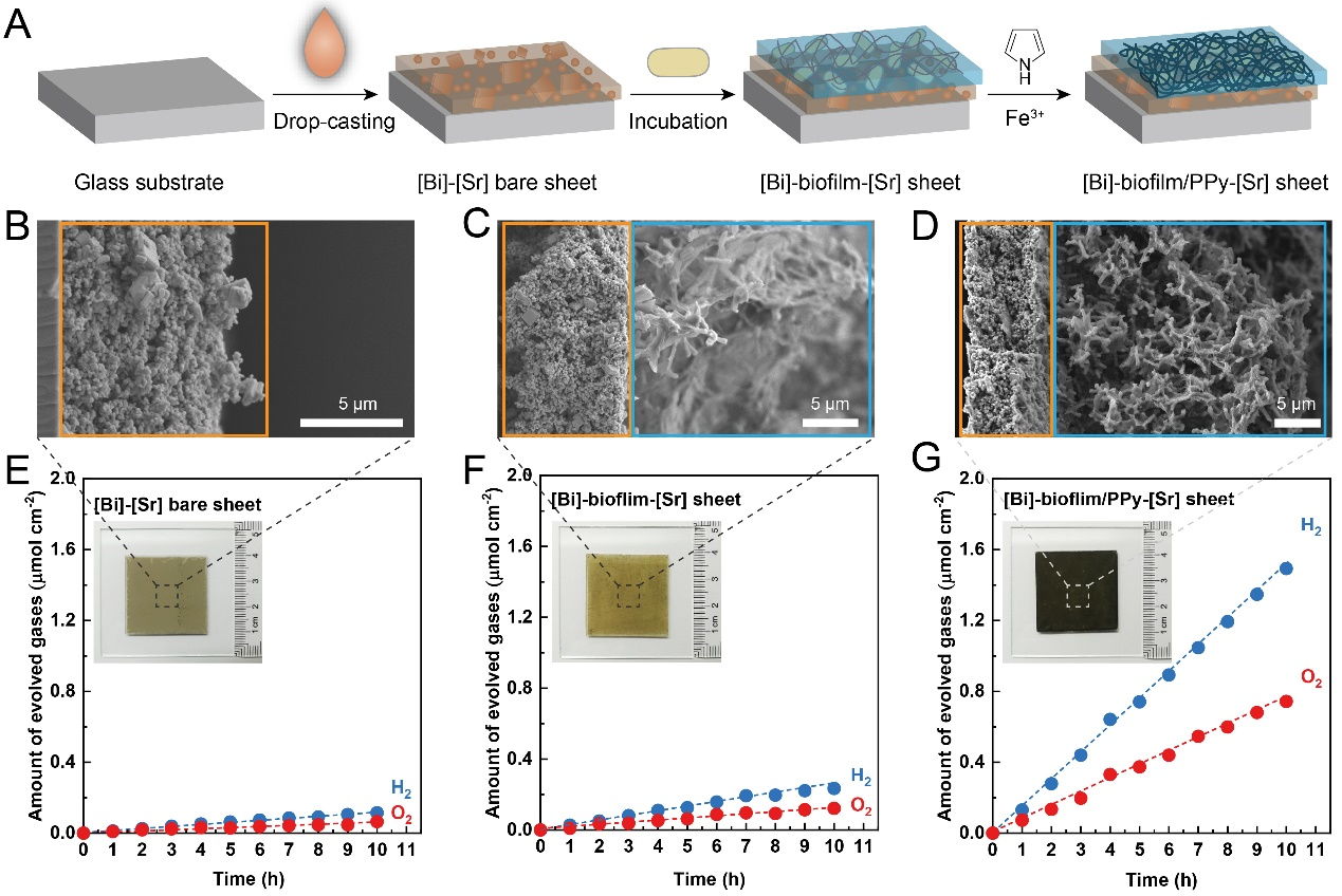 本项目提出了结合导电生物被膜和无机光催化剂,构建稳定且可持续的半人工杂化Z-scheme体系的方案(图1B)。本项目选择了具有可见光吸收特性和高光催化活性的CoOx/Mo:BiVO4(缩写为[Bi])作为产氧催化剂(OEP)和Ru@Cr2O3/Rh:SrTiO3(缩写为[Sr])作为产氢催化剂(HEP),并通过滴涂法制备了光催化剂薄膜。随后在光催化剂涂层表面直接生长大肠杆菌生物被膜,并通过原位聚合制备导电生物被膜。导电生物被膜能够促进光照下从OEP到HEP的有效电子转移,从而实现光催化全解水。
