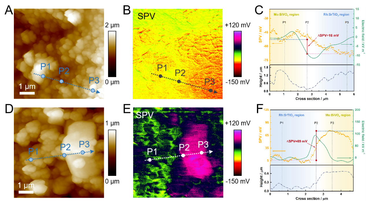 为了理解微观尺度下的电荷分离效果,本项目采用了光辅助的开尔文探针力显微镜(AM-KPFM)对半人工杂化涂层进行了探究(图4)。在光照条件下,[Bi]和[Sr]之间的ΔSPV为69 mV,相应的内置电场为95 kV m-1,相比非导电生物被膜涂层,电荷分离和迁移都得到了显著增强。共形贴附导电生物被膜可以在微观上增强2种半导体光催化剂的电荷分离和迁移,这一结果也印证了光催化全解水的实验结果。