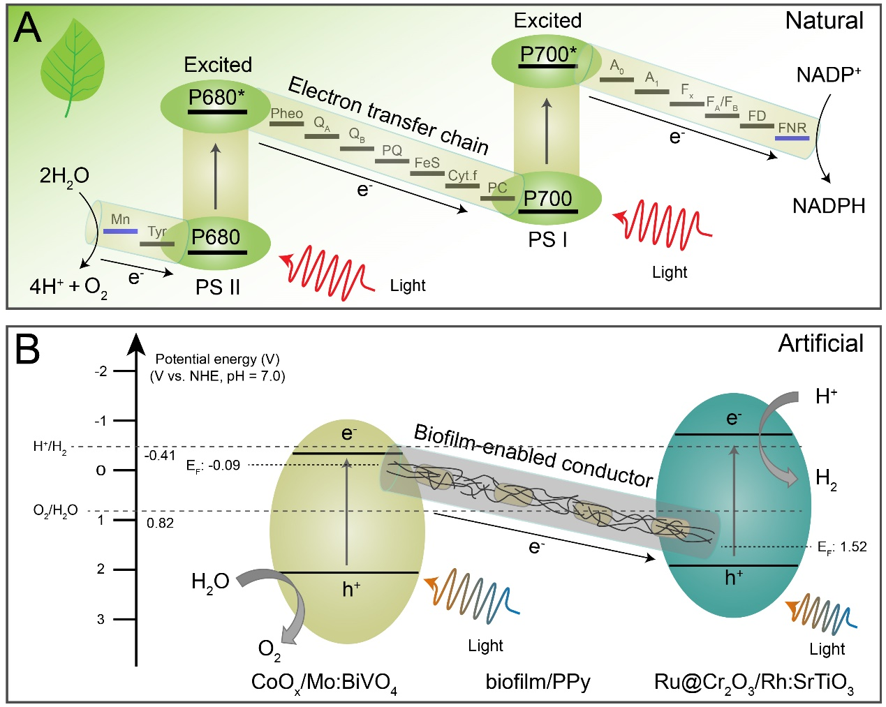 Science Advances | 共形贴附导电微生物生物被膜实现半人工光催化全解水,开发活体能源材料新应用