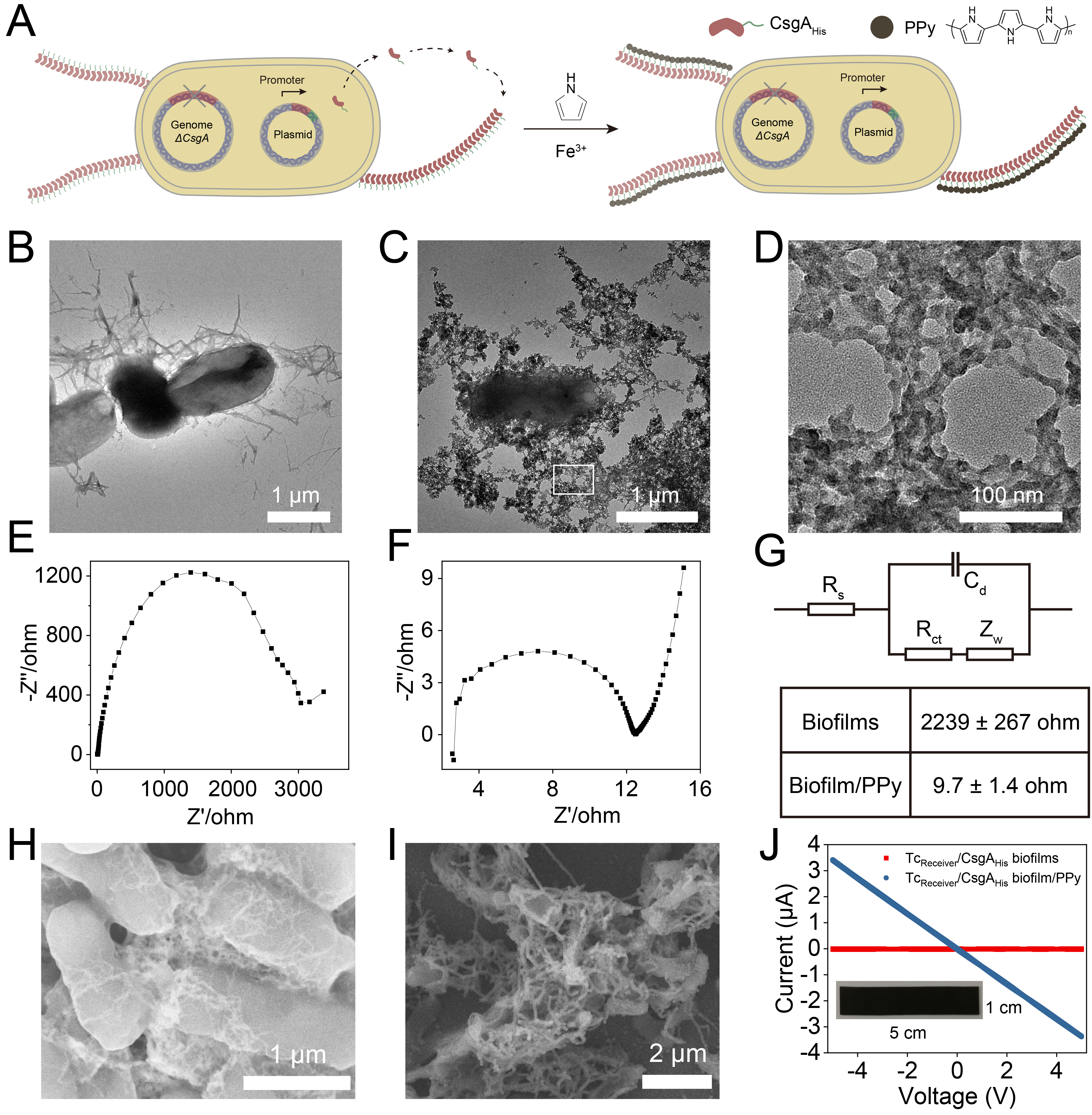 大肠杆菌生物被膜在自然界是不导电的物质,为了实现导电生物被膜的制备。该研究提出了原位聚合聚吡咯(PPy)的方法,进行共形贴附的导电生物被膜制备(图2)。由于固有的界面粘附性,生物被膜可以在基底表面上形成共形贴附的涂层,工程化的生物被膜纤维带有电荷,从而实现了聚吡咯的原位聚合,相互连接的聚吡咯颗粒赋予了生物被膜导电能力。电化学交流阻抗测试和I-V测试证实了通过该方案制备的材料不论在液体环境还是空气环境都具备良好的导电性。这些测试预示着除了光催化外,还可能在电子器件和设备方面有潜在应用。