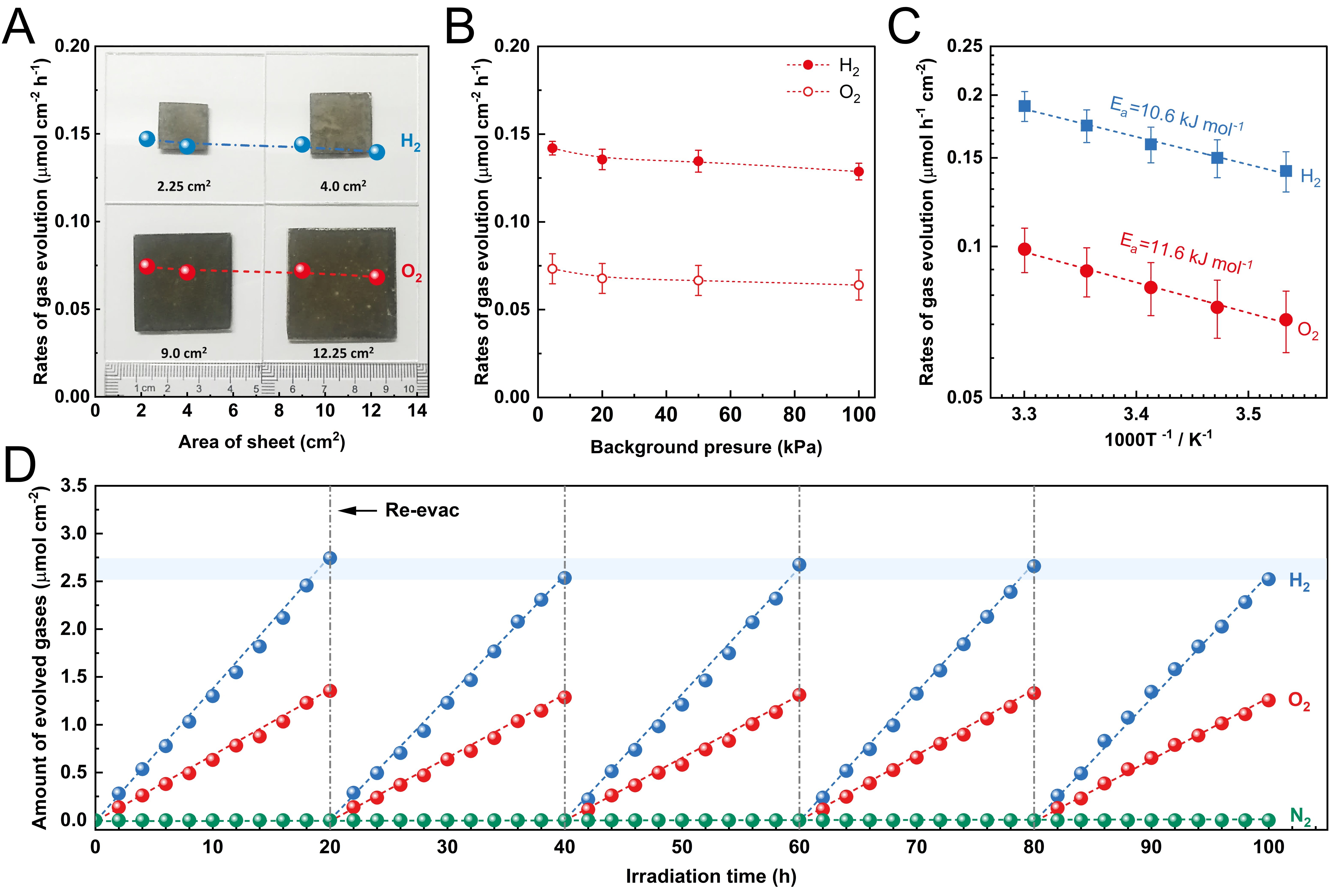 本研究开发的半人工杂化涂层的制备方案简单,易于规模化制备。本项目测试了不同面积尺寸的杂化涂层的光催化全解水,催化效率基本保持不变,证实本研究开发的基于生物被膜的半人工杂化Z-scheme涂层的规模化生产潜力。本研究开发的杂化涂层对于背景压力有很强的耐受性,在常压条件的催化效率依然维持不变,可以克服金属导电材料容易发生逆反应并显著降低催化效率的缺陷。本研究开发的体系展示了100 h的长时间运行稳定性,并且催化效率可以维持不变,材料的结构也没有被破坏。
