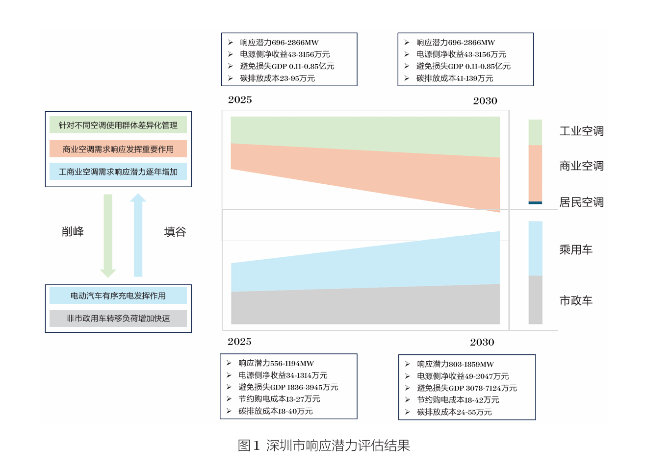 在深圳虚拟电厂资源中,本报告重点分析了空调和电动汽车的调控响应潜力,对这两大领域的市场潜力和经济效益进行了详细评估。研究发现,在响应潜力评估方面,最佳情景下,2030年深圳市空调调节潜力可达4844兆瓦,削峰能力达到最高用电负荷16%,电动汽车调节潜力可达1859兆瓦,填谷能力达到低谷用电负荷10%。在响应经济性评估方面,空调的响应经济效益主要体现在避免发电成本、减少碳排放成本及GDP损失方面,而电动汽车响应经济性主要以避免发电成本、减少碳排放成本、GDP损失及充电峰谷分时电价的差价优惠表现。最佳情景下,2030年,假设深圳市约65%居民户和51%工商业空调提供灵活性资源响应,单次响应可避免发电成本约在1608-6438万元之间,实现净经济效益284-5114万元,避免损失GDP1.78亿元,减少碳排放成本139万元;43%电动汽车提供灵活性资源响应,单次响应可避免发电成本约在644-2577 万元之间,实现净经济效益114-2047万元,避免损失GDP 0.71亿元,减少碳排放成本55万元。