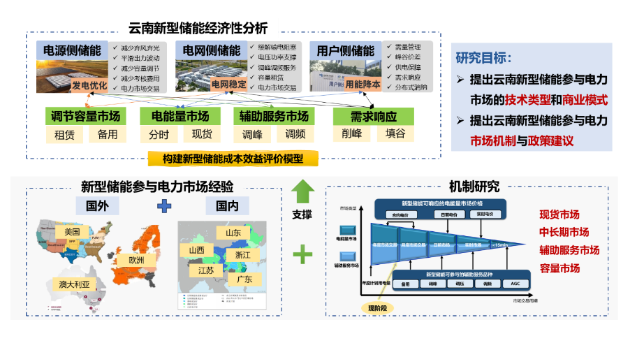 构建云南新型储能经济性分析及市场机制研究框架,涵盖电源侧、电网侧和用户侧储能应用,匹配调节容量、电能、辅助服务和需求响应四类市场,结合国内外经验,构建经济性评估模型,提出支持储能参与多层级市场的机制和政策建议。