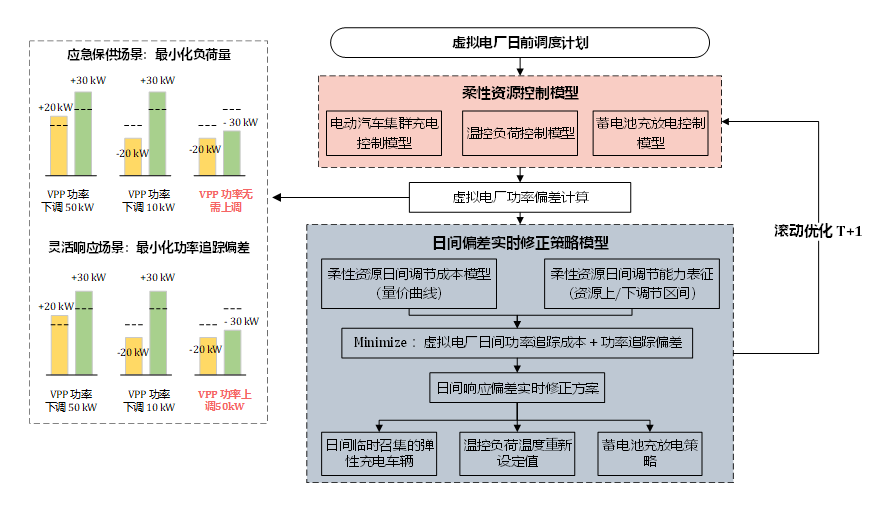 提出虚拟电厂多元资源协同日前-日间协同调控方法,可实现日间调控偏差的实时修正,满足电网应急保供场景(最小化用电量)和灵活响应场景(最小化功率追踪偏差)需求,同时确保虚拟电厂调控成本最低。