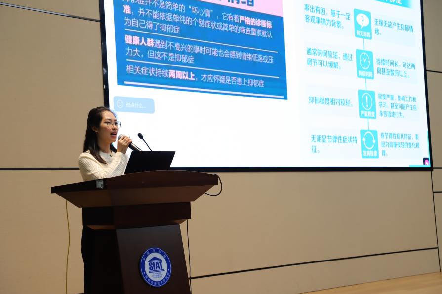 南方科技大学心理咨询师何慧雯作《自我疏导大妙招》师生心理安全培训。何慧雯从“抑郁情绪与抑郁症的识别”切入,系统解析了新时代背景下抑郁症的多元表现形态,并引导师生科学、理性地认识相关心理问题。她进一步提出“笑、动、说、悟、观”五维一体的自我疏导策略,倡导师生通过积极情绪调节、适度运动、有效沟通、自我觉察与正念体悟等方式,缓解科研与日常生活中的压力,提升心理健康水平。