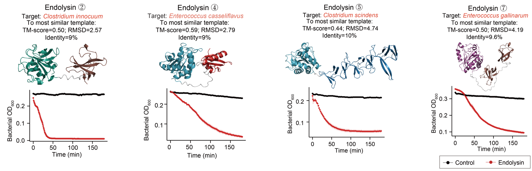 噬菌体裂解酶是一种噬菌体编码的溶菌酶,能够高效切割细菌细胞壁。通过系统分析噬菌体裂解酶的结构多样性,研究团队发现其存在结构域重排的进化机制。进而选取人体肠道致病菌噬菌体来源的裂解酶,通过合成生物学技术,成功验证了其对人体肠道致病菌的裂解活性(图3)。此外,一部分噬菌体裂解酶具有很高的物种靶向性,有望成为微生物组精准编辑的平台技术。