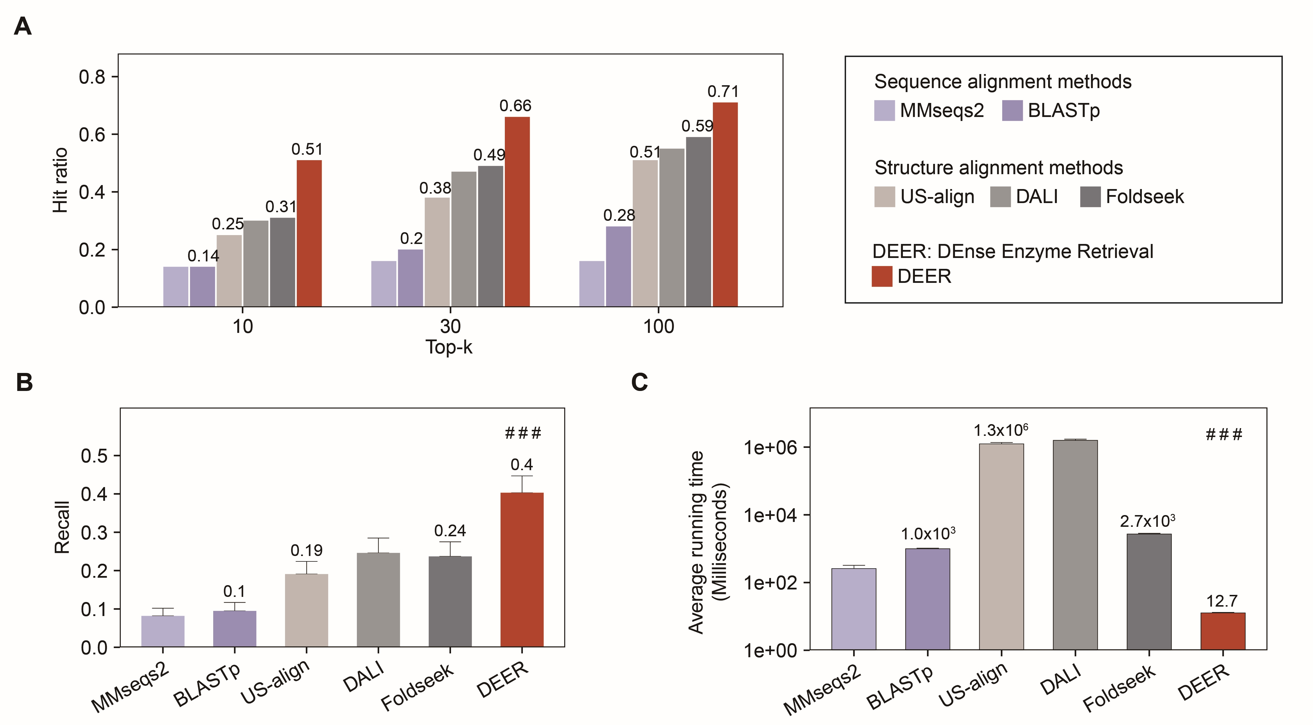 最后,研究团队开发了人工智能方法Dense Enzyme Retrieval(DEER),能够快速、高效识别同工酶,其性能显著优于现有的基于序列或结构比对的方法(图6)。DEER的模型训练运用了融合结构信息的蛋白质语言模型及对比学习技术,实现了对酶功能的准确预测;DEER模型的推理运用了稠密检索技术,实现不依赖传统序列或结构对齐的快速检索;DEER模型的框架不仅适用于远源酶的挖掘,未来还可进一步拓展到其他功能的蛋白研究。