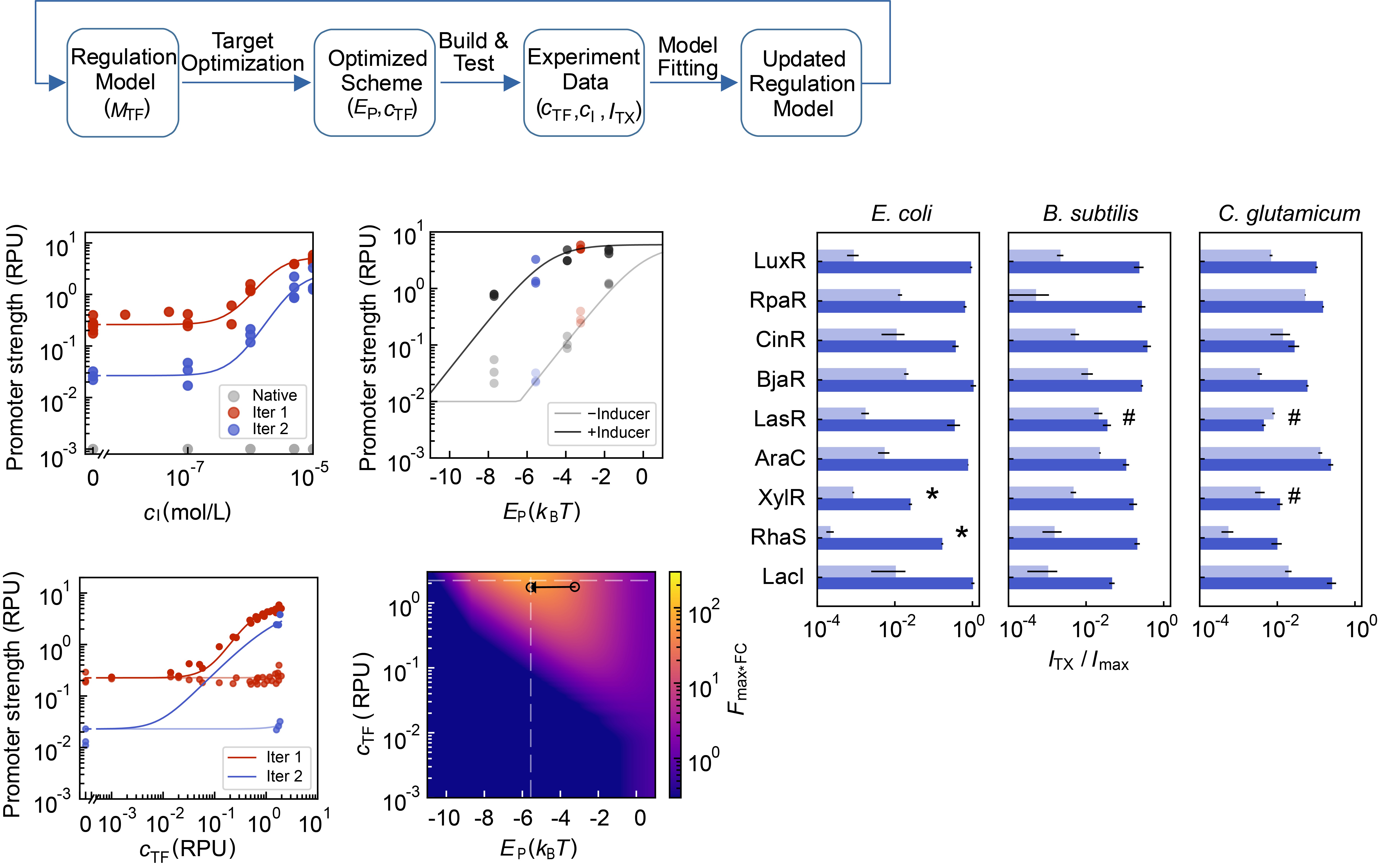 细菌在自然进化中演化出精密的基因表达调控网络,其内在复杂性往往成为合成生物学工程设计的“黑障”。研究者在进行启动子或转录因子的跨宿主移植时,常因胞内环境差异引发元件互作模式改变,进而面临性能严重衰减的难题。为突破这一瓶颈,该研究摒弃了传统的“覆盖式筛选”和纯粹的“黑箱预测”路径,创新地提出了一套融合“白箱”物理机理与全局约束条件的建模与优化框架。