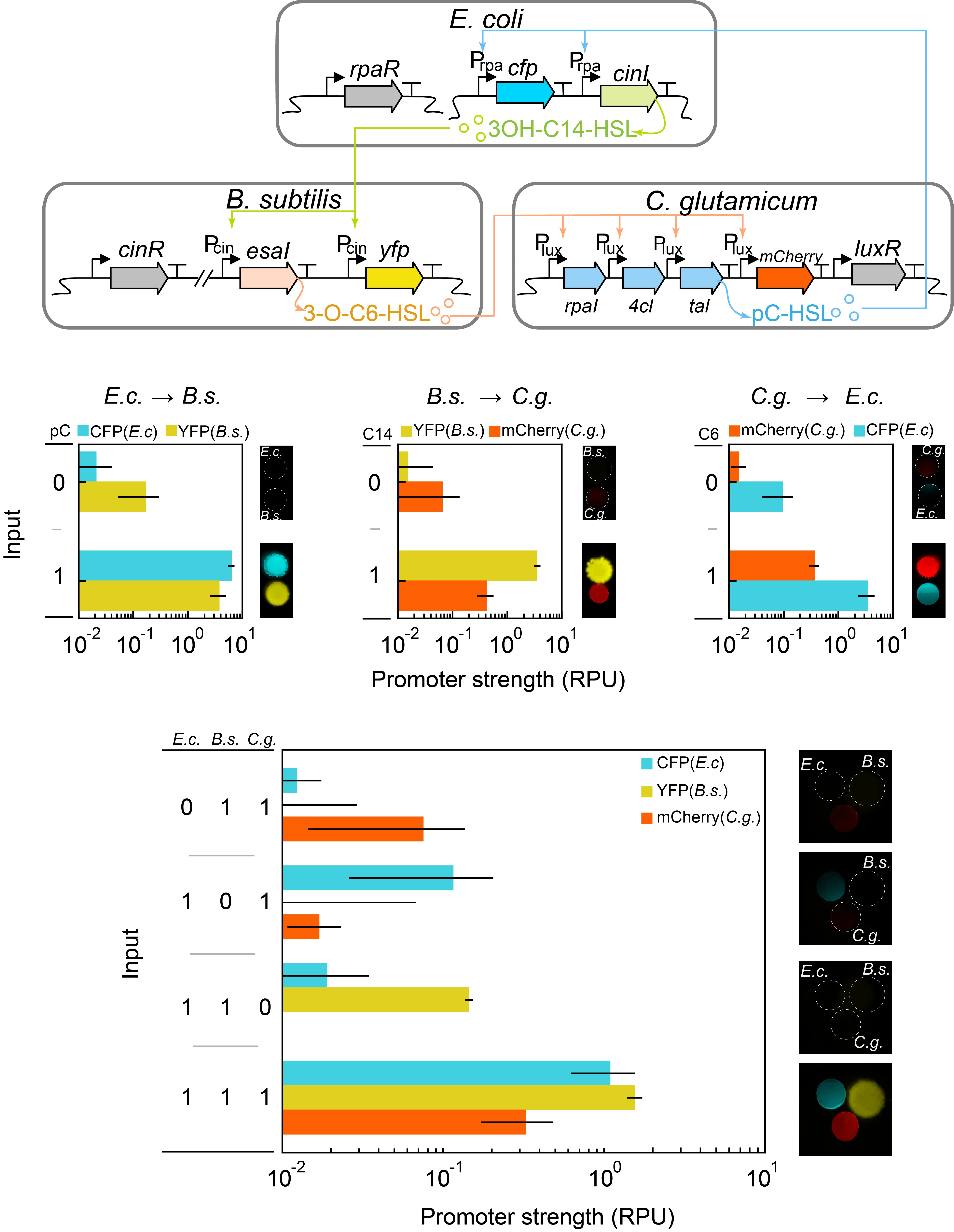 其次是复杂通讯线路的构建:基于优化后的元件,团队成功构建了包含“发送者-传感器-报告器”的人工细菌群体通讯网络。实验结果表明,这些经T-Pro优化的线路能够克服跨物种移植时的“水土不服”,在三种不同底盘中实现了高效、低泄漏的信号级联与中继,解决了基因元件在跨宿主移植时性能下降的经典难题。
