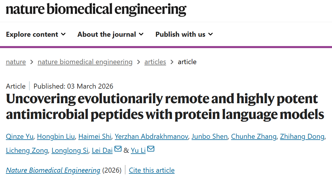 2026年3月3日,中国科学院深圳先进技术研究院(简称“深圳先进院”)定量合成生物学全国重点实验室、合成生物学研究所戴磊研究员课题组联合香港中文大学李煜教授团队,在Nature Biomedical Engineering发表了题为“Uncovering evolutionarily remote and highly potent antimicrobial peptides with protein language models”的研究论文。该研究开发了基于蛋白质语言模型和深度学习的抗菌肽挖掘新方法HMD-AMP,成功突破传统技术瓶颈,挖掘出大量进化远源、高活性且低毒性的抗菌肽,为新型抗菌药物研发提供了新策略和候选分子。
