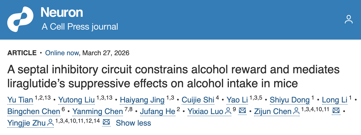 3月27日,中国科学院深圳先进技术研究院脑认知与脑疾病研究所/深港脑科学创新研究院朱英杰、陈子君团队联合湖南师范大学罗宜孝、香港城市大学贺菊芳、中山大学附属第三医院/第八医院陈燕铭团队在国际神经科学期刊Neuron在线发表题为“A septal inhibitory circuit constrains alcohol reward and mediates liraglutide's suppressive effects on alcohol intake in mice”的研究论文。