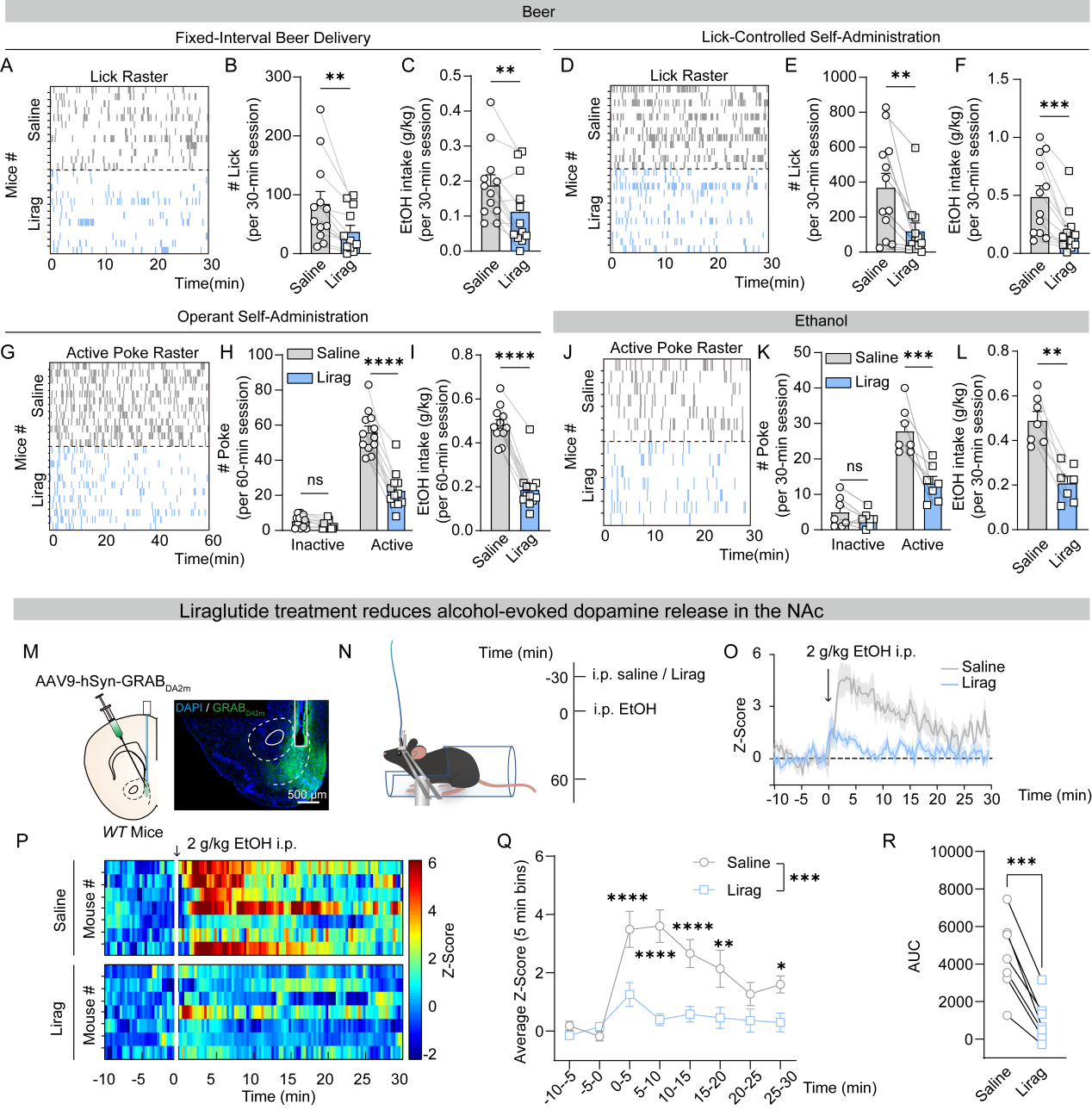 图1. 利拉鲁肽直接抑制饮酒行为并降低酒精诱发的多巴胺释放