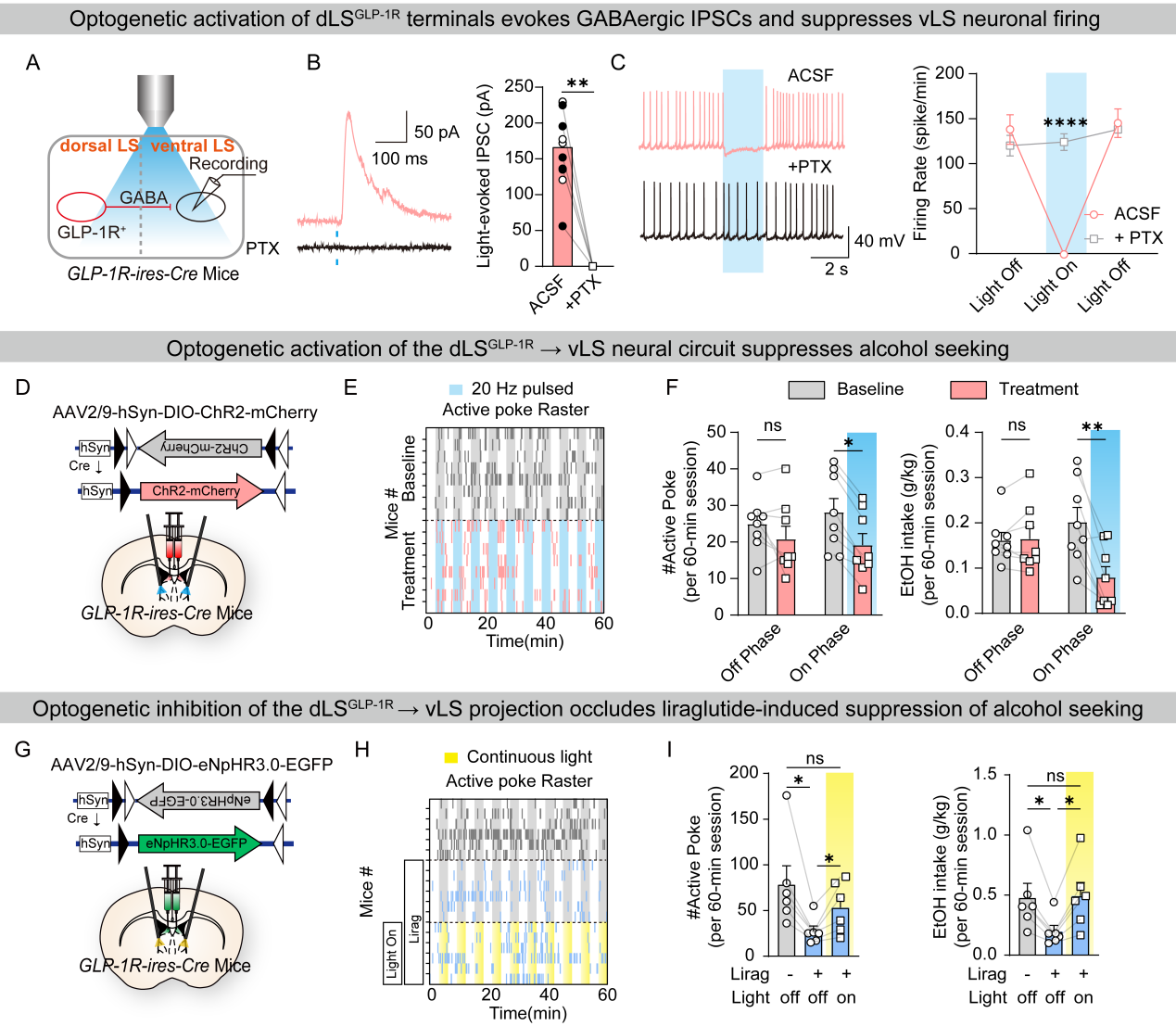 在明确外侧隔核(LS)是GLP-1RA发挥作用的关键脑区后,研究人员进一步解析了其内部环路结构。结果发现,背侧LS(dLS)中表达GLP-1R的神经元向腹侧LS(vLS)发出GABA能抑制性投射,构成一条方向明确的局部抑制性微环路。电生理记录显示,光激活dLSGLP-1R神经元的轴突终末,可在vLS神经元中诱发显著的抑制性电流,并降低其放电频率,证明该通路具有直接的功能抑制作用。在行为层面,特异性激活dLS→vLS投射显著降低酒精寻求与自给行为;相反,当选择性阻断该投射时,利拉鲁肽对饮酒行为的抑制效应明显减弱。这一结果表明,dLS→vLS抑制性微环路不仅参与酒精奖赏调控,而且是GLP-1RA发挥作用所必需的关键通路。外侧隔核通过这一局部抑制性环路对奖赏驱动信号进行精细调控,从而限制酒精强化信号的过度放大。