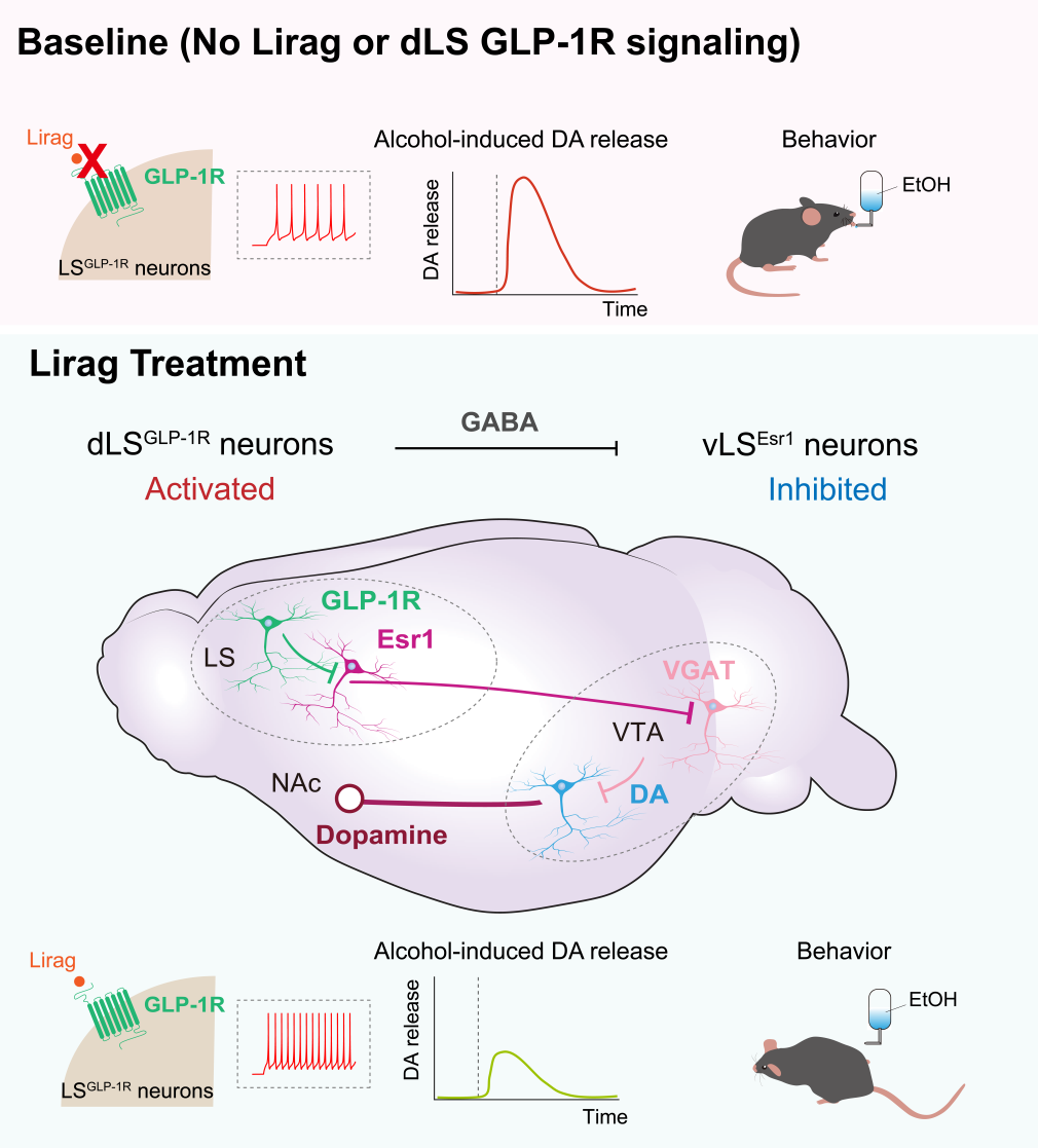 综上,本研究在神经环路层面明确了GLP-1信号调控酒精奖赏的关键因果关系:利拉鲁肽激活外侧隔核GLP-1R神经元,启动dLS→vLS抑制性微环路,进而调控VTA多巴胺神经元活动,最终降低伏隔核多巴胺释放并抑制酒精强化信号输出。该研究从“细胞类型—局部微环路—经典奖赏通路”三个层级系统揭示了代谢信号如何嵌入中脑奖赏网络,不仅为理解代谢调控与成瘾行为之间的神经联系提供了新的环路框架,也为GLP-1类药物在酒精使用障碍等成瘾性疾病中的潜在应用提供了重要理论依据。