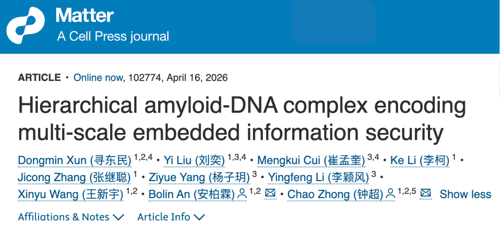 受自然生命系统启发,合成生物学家正在尝试将“信息安全”直接写入材料本身。4月16日,中国科学院深圳先进技术研究院定量合成生物学全国重点实验室、合成生物学研究所钟超团队在Cell Press旗下期刊Matter发表研究论文,题为“Hierarchical amyloid-DNA complex encoding multi-scale embedded information security”。该研究开发了一种多层级信息加密平台——HIDE(Hierarchical Information-encrypting DNA-Engineered coatings)。这一平台将可编程淀粉样蛋白纳米纤维与DNA分子结合起来,使一层近乎透明的微米级涂层同时兼具材料载体与信息载体的双重功能,可实现跨尺度信息隐藏和分级验证,为防伪与物理信息安全打开了新思路。