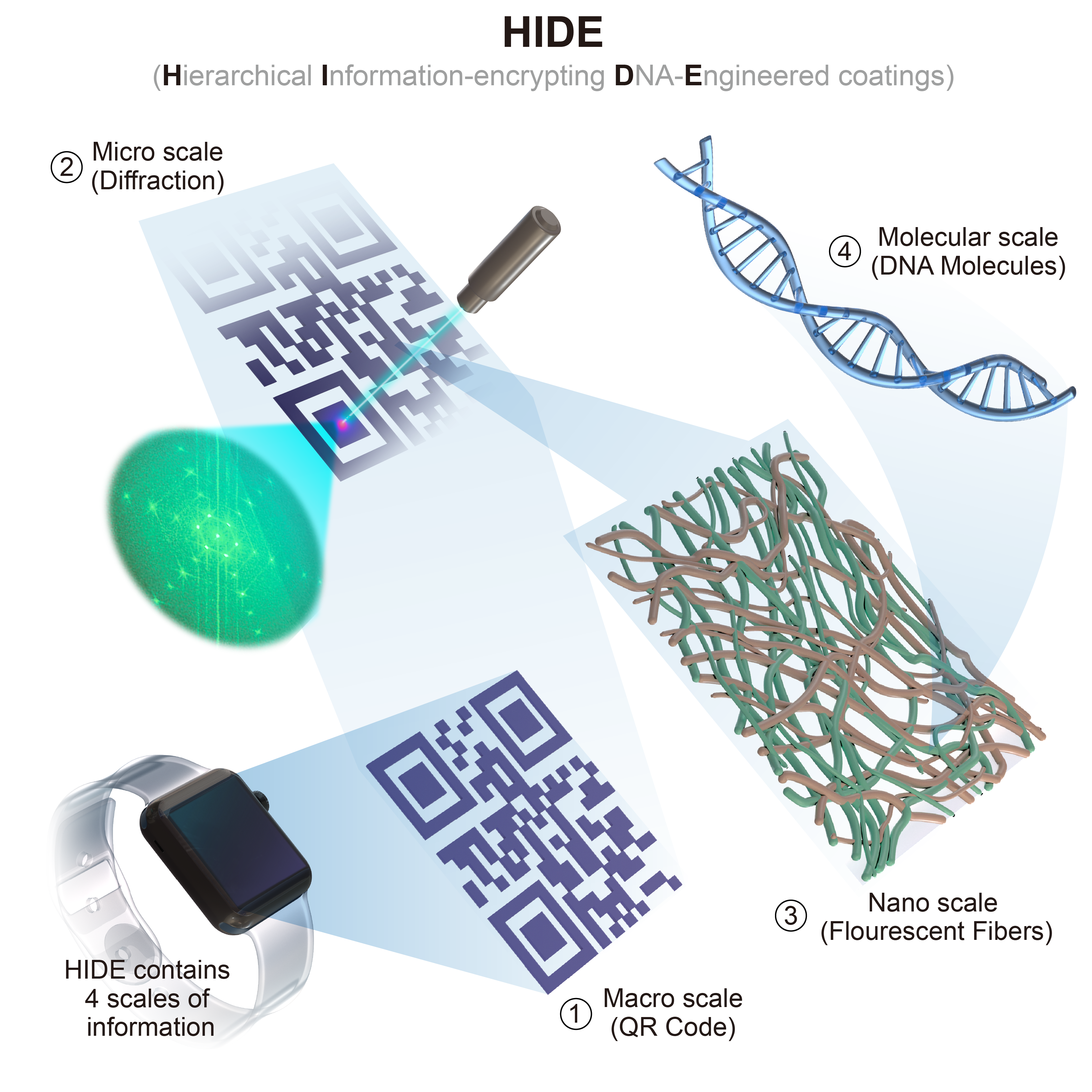 传统防伪技术通常只能在单一尺度上承载信息,例如图案、颜色变化或特定光学响应等。HIDE的独特之处在于,它将多层级信息集成于同一重组蛋白纤维-DNA涂层之中,构建出一个跨越宏观、微观、纳米及分子尺度的“四重密码”体系(图1)。其中,第一重为宏观尺度信息,例如仅在特定光照条件下显现的二维码,可由手机直接读取;第二重为显微尺度信息,包括微图案和衍射图样,需要借助显微镜或激光进行识别;第三重为纳米尺度信息,体现为蛋白纳米纤维不同的组装方式及结构排布;第四重则为分子尺度信息,即直接编码于DNA序列中的加密内容。不同层级的信息分布于不同空间尺度,并对应差异化的读取方式。换言之,一层看似普通的透明涂层,实际上能够同时承载公开识别信息、进阶验证信息以及深层机密信息,从而形成层层递进的防伪与认证体系。