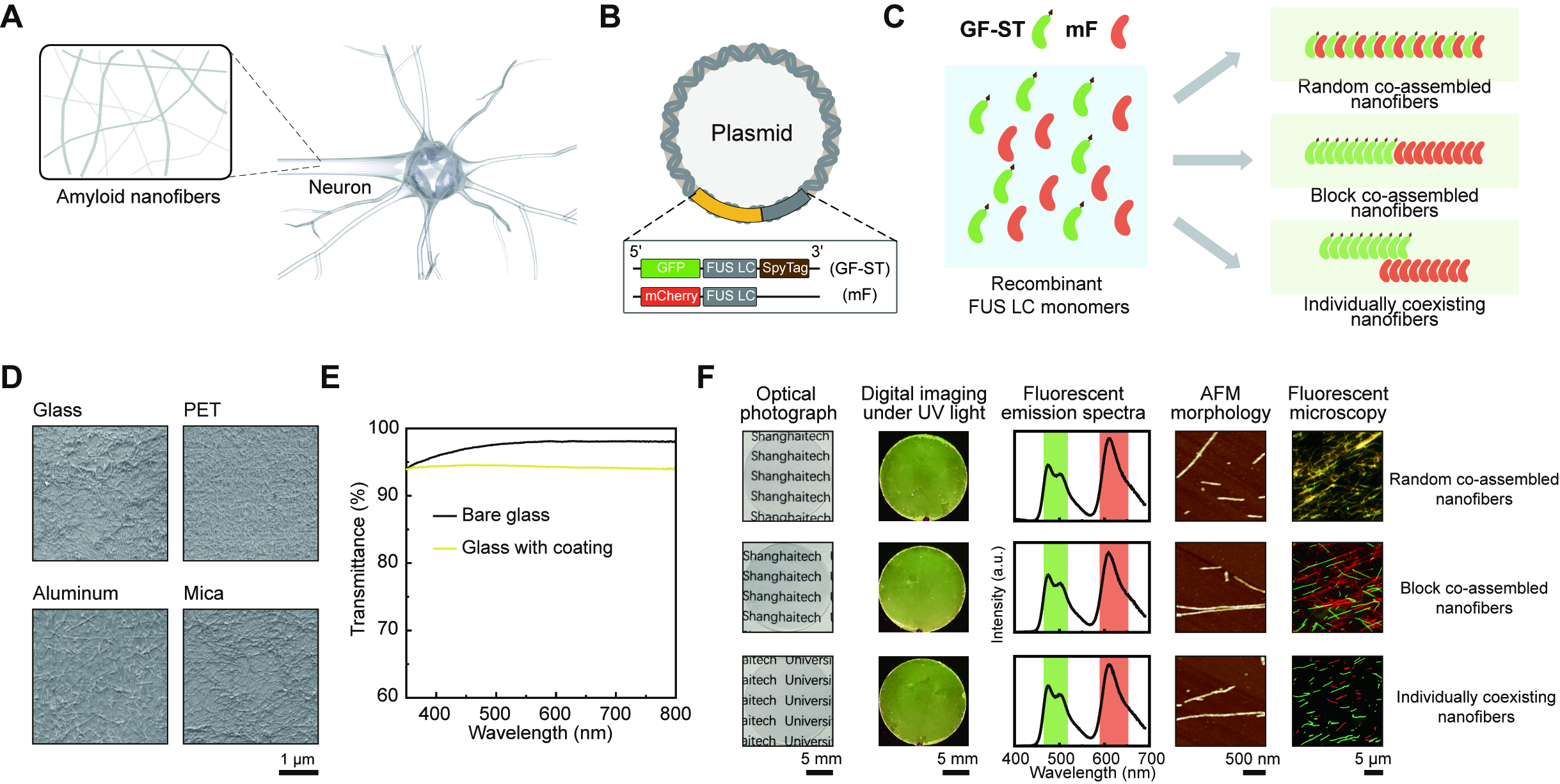 HIDE的核心是一种能够自组装形成涂层的蛋白纳米纤维材料。研究团队以人源FUS蛋白为基础,设计了两类带有不同荧光信号的重组蛋白:一类发绿色荧光,另一类发红色荧光(图2)。这些蛋白在合适条件下能够自发组装成细小的纳米纤维,并进一步附着在玻璃、铝片、PET和云母等多种材料表面,形成均一稳定的涂层。更特别的是,这种涂层几乎是“隐形”的——在玻璃表面,其可见光透过率超过94%,肉眼看上去就像一层几乎不存在的透明薄膜(图2)。